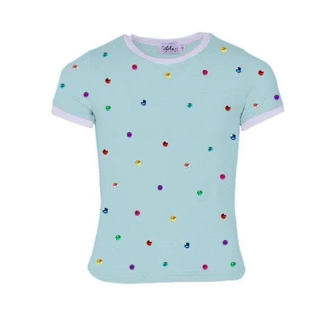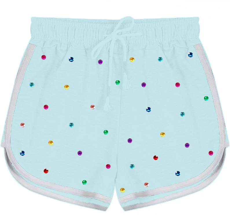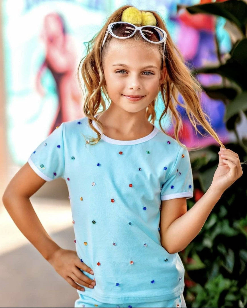 Baby blue short sleeve and shorts set with assorted rainbow gems all over! Sure to shine all summer long in this set!Â