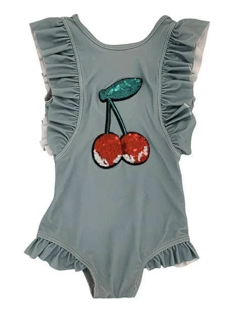 Mint green ruffle sleeved one piece swim suit with sequin cherry patch!Â