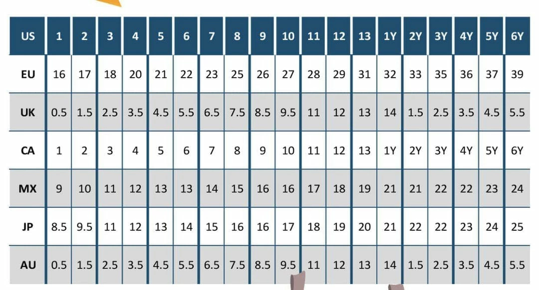 | Size | 8C (24), 9C (25), 9.5C (26), 10C (27), 10.5C (28), 11C (29), 12C (30), 13C (31), 1Y (32), 2Y (33), 3Y (34), 4Y (35), 5Y (36) |