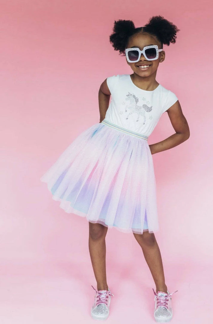 The most adorable elastic waist dress with crystal unicorn and a pink and purple ombre tulle skirt! Perfect for any occasion.