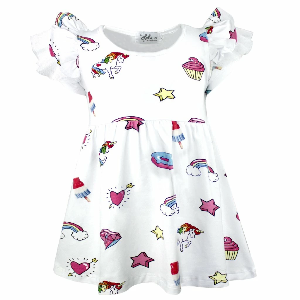 This magical dress is made of a lightweight cotton, and has ruffled shoulders, a flared skirt, and adorable donuts, rainbows, unicorns and more fun designs all over!