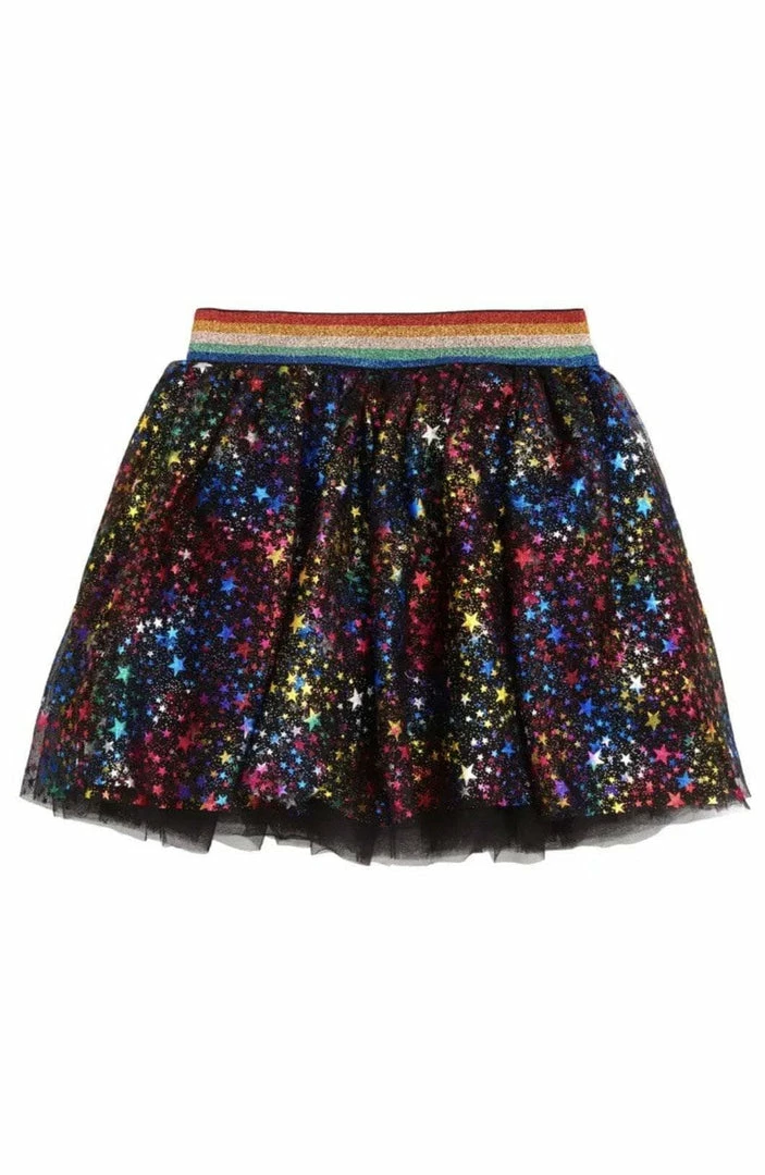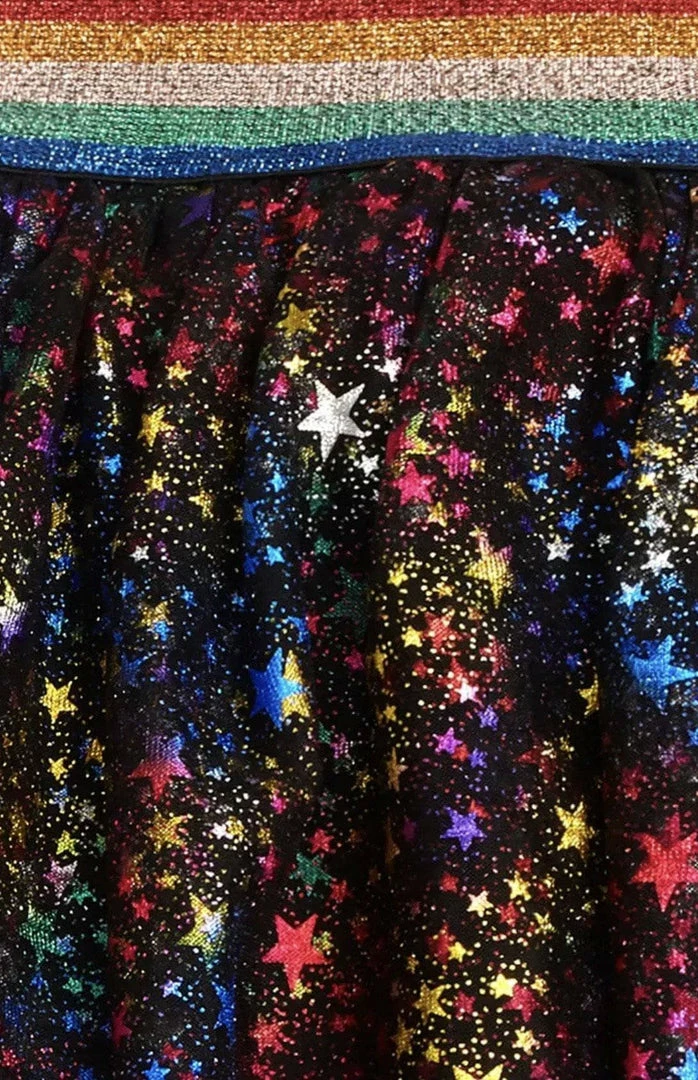Girls rainbow foil stars decorate this cute tutu with a rainbow elastic waistband with multiple color options. Â