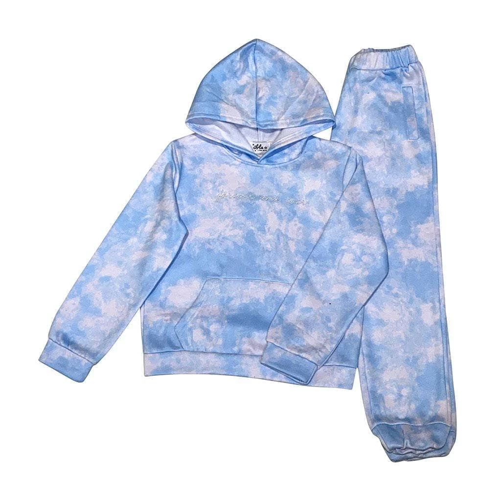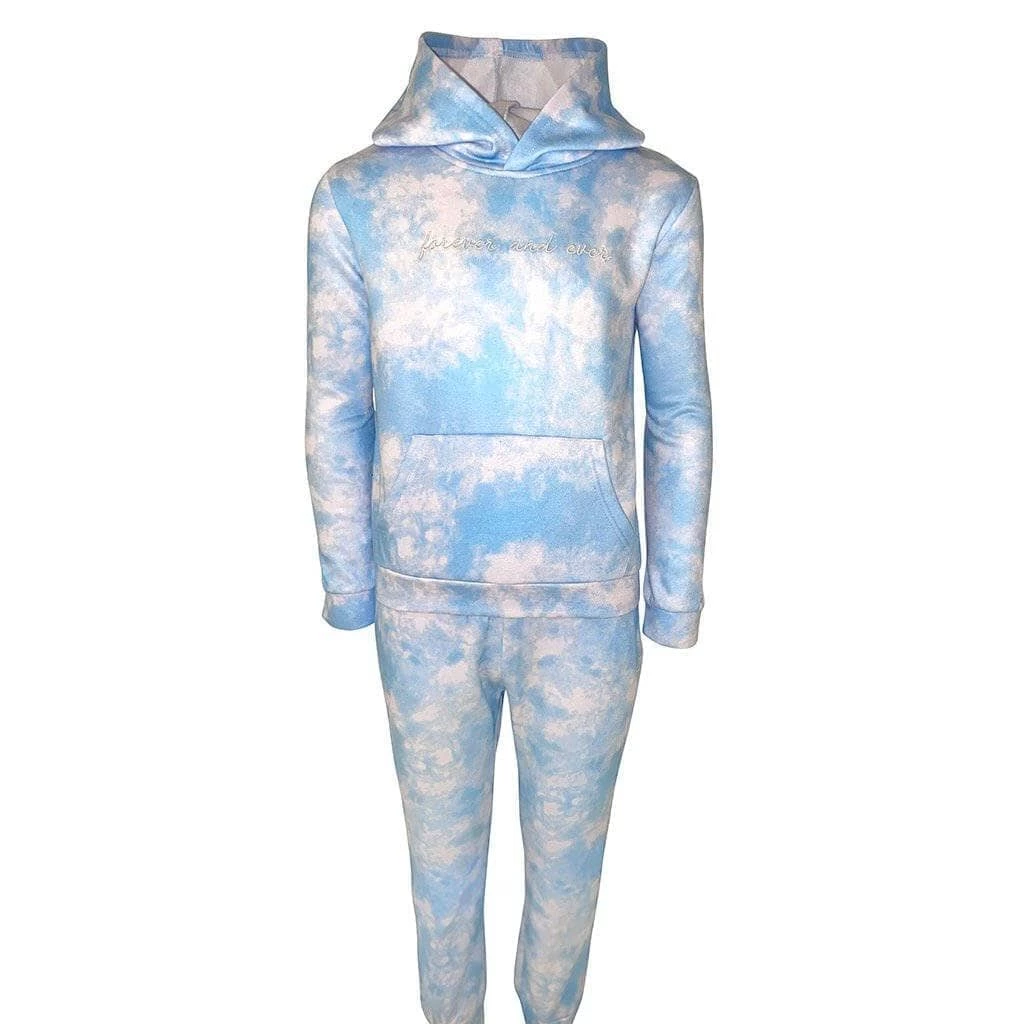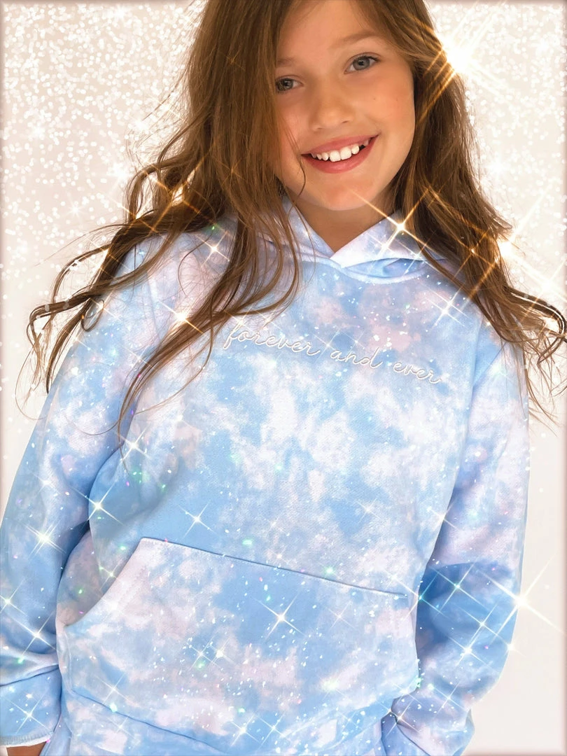Blue cloud tie dye print , super soft fleece fabric with forever and ever embroidered on the front .