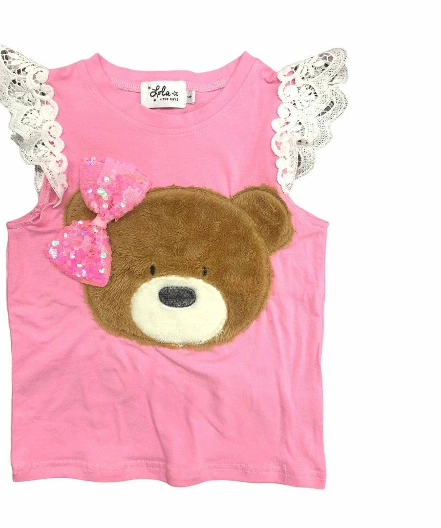Pink heathered tank with lace sleeve details and fuzzy teddy bear patch with pink bow!