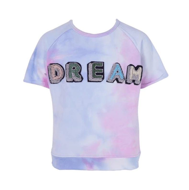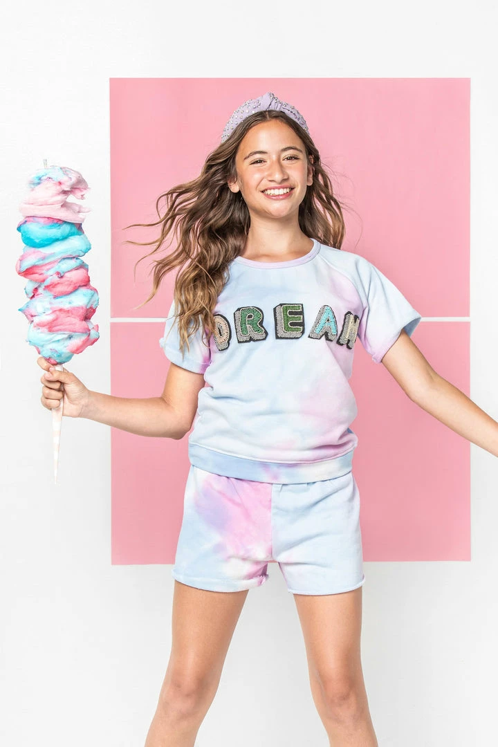 This tie dye track set features beautifully beaded patches and blue/purple hues!