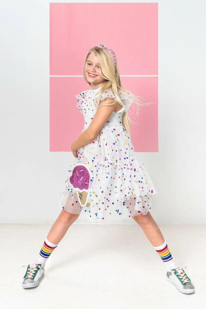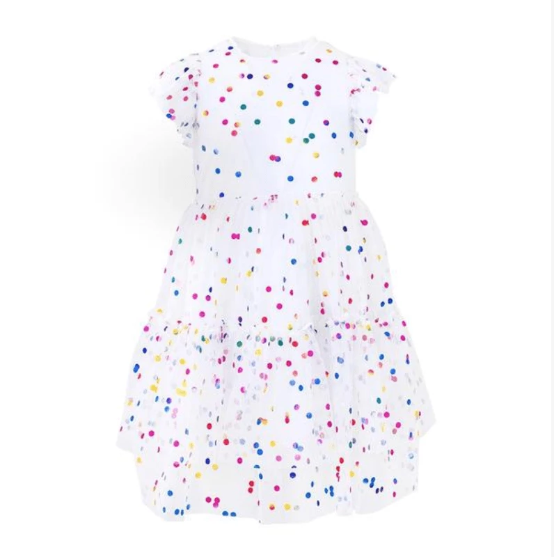 A classic white cotton dress covered in our favorite colors for a fun celebration outfit!