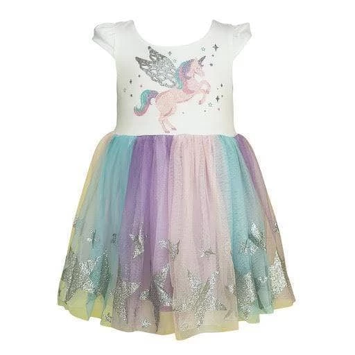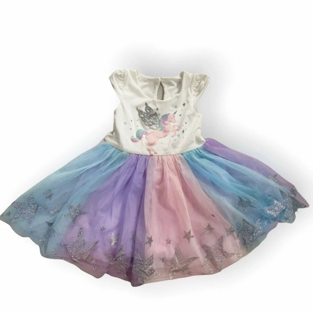 A beautiful t-shirt dress with glitter pastel unicorn and a tulle colorful skirt. This sweet dress is perfect for any special occasion, and will make your little girl feel like a magical princess!Â