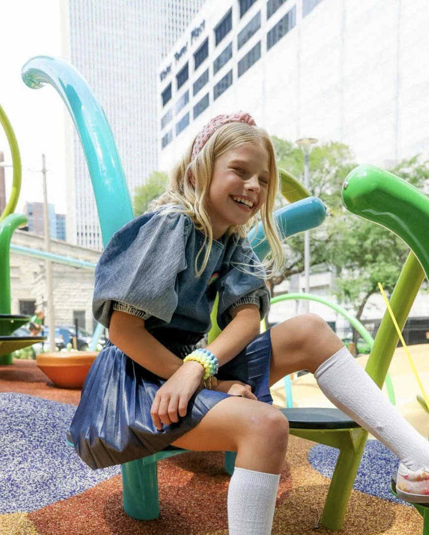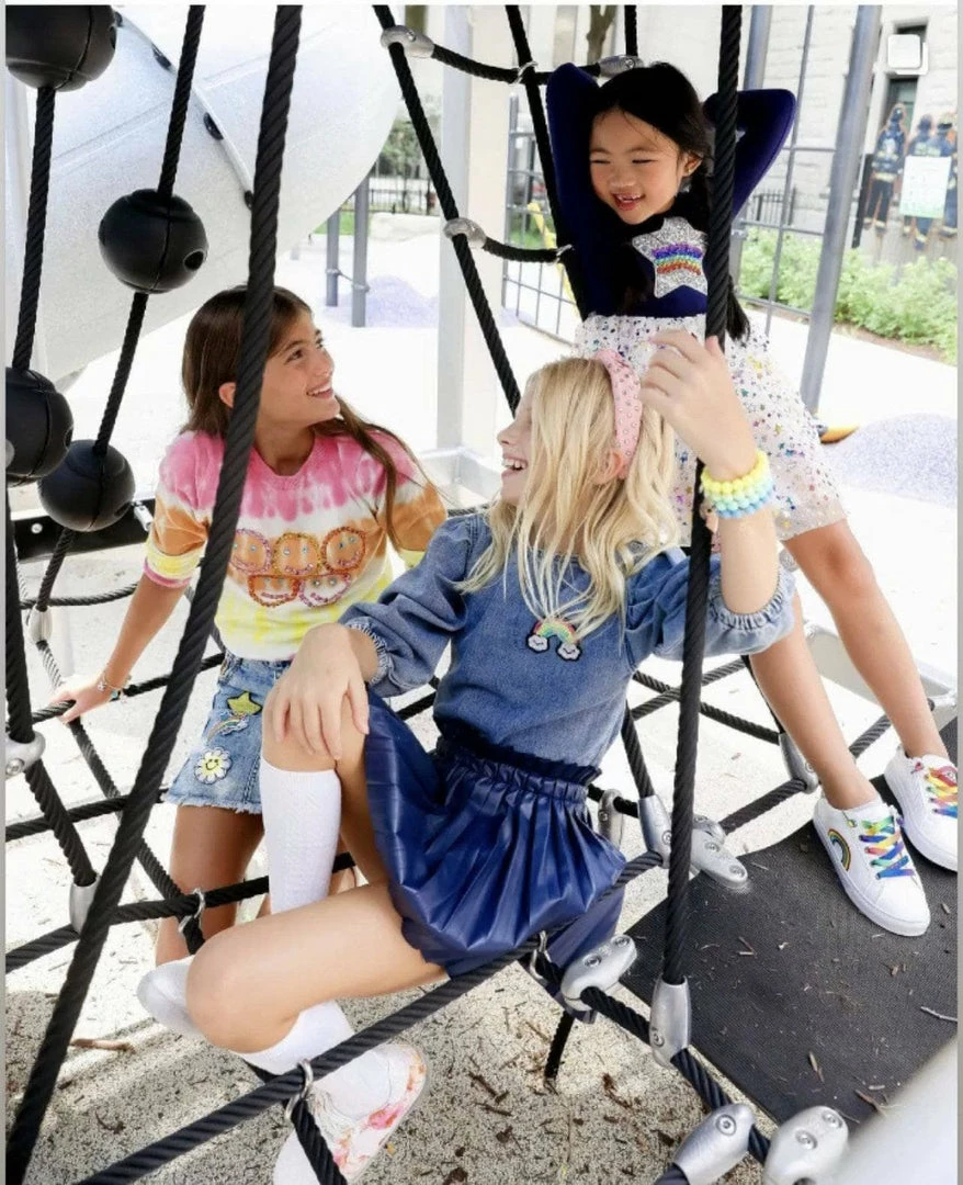 Lightweight denim bell sleeve top with happy rainbow patch! Zipper fasten in the back.Â