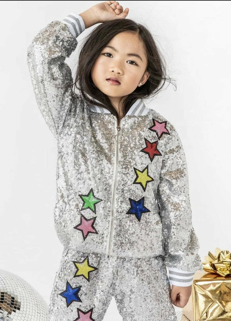 Best Seller! Girls Unicorn sequin bomber features a sequined rainbow inspired unicorn on the back and matching rainbow star accents on the front.