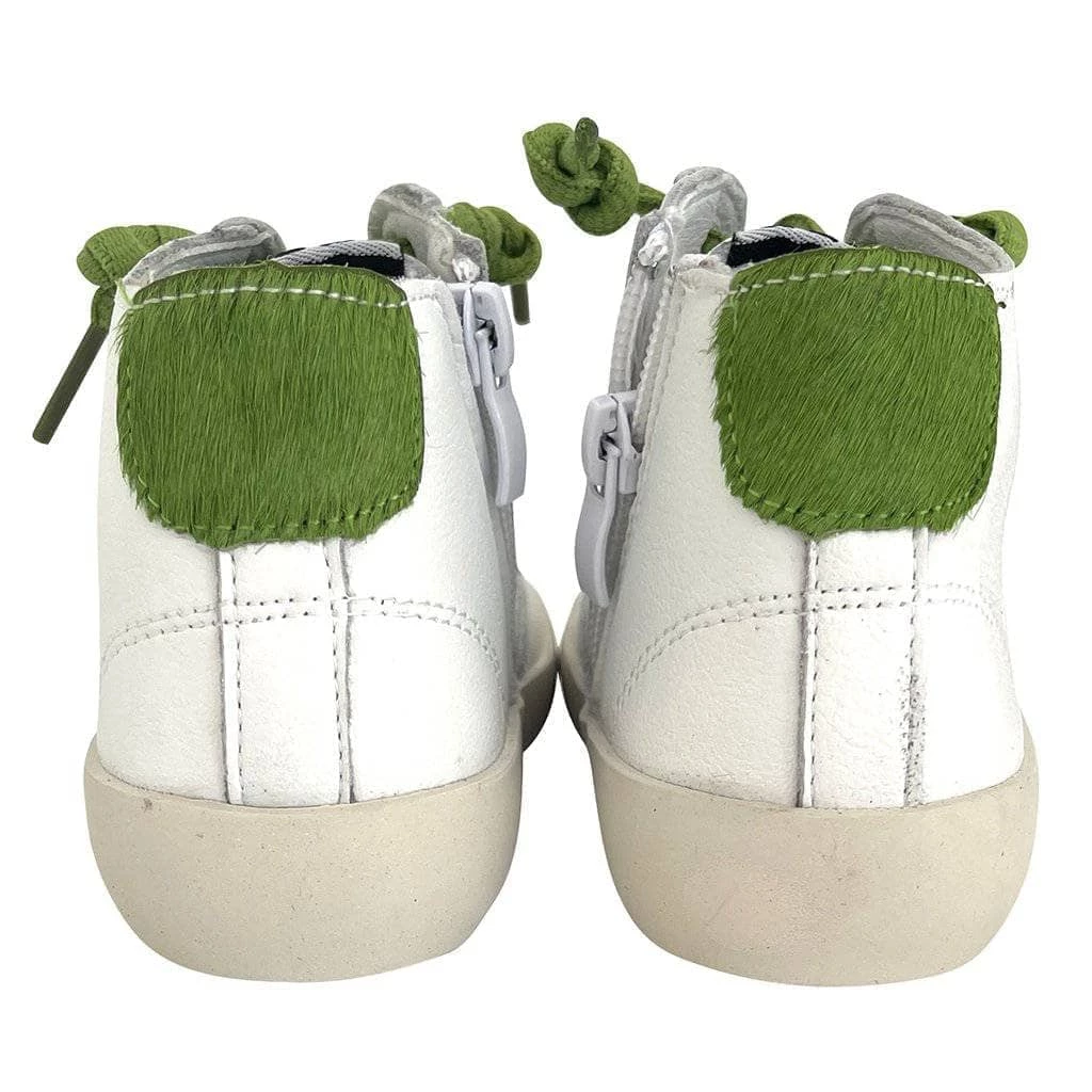 The coolest green faux fur accented white and grey star sneakers!