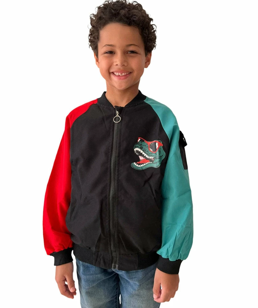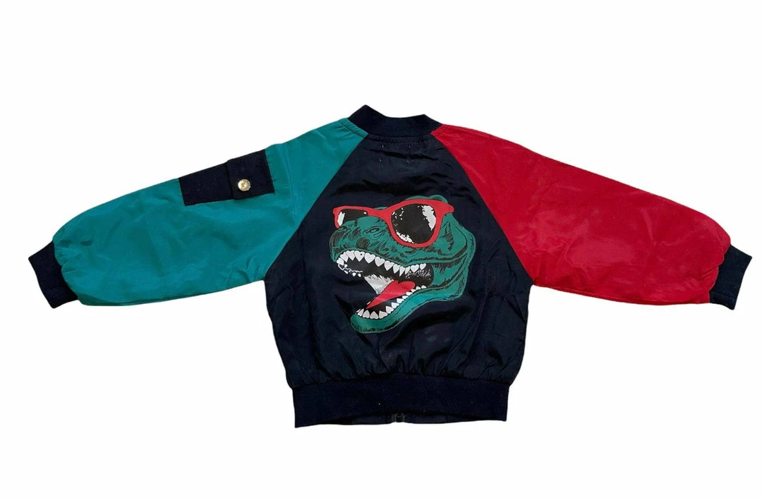 The light and fun green, white, and black zip up bomber with a very happy dino in sunglasses!