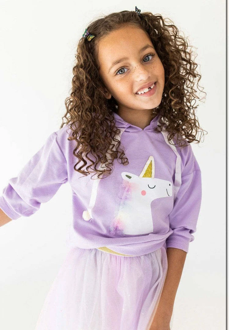Lavender light weight hoodie with cute happy unicorn on the front paired with matching pastel tutu!Â