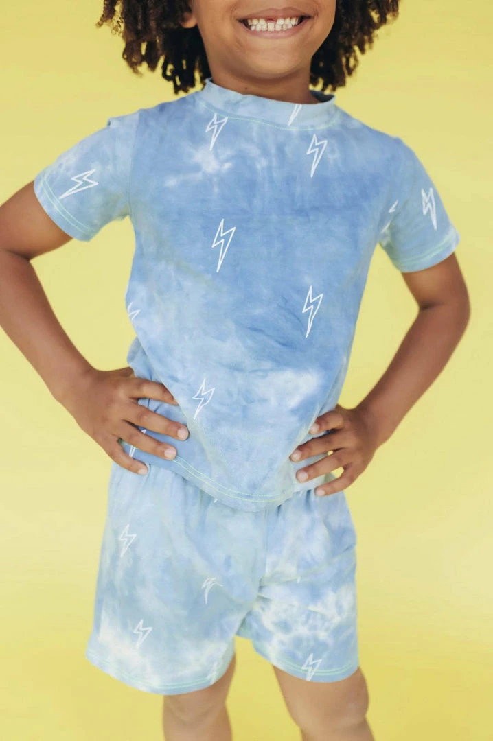 Grey tie dye with white lightning flashes cotton material short sleeve shirt and comfy shorts set!
