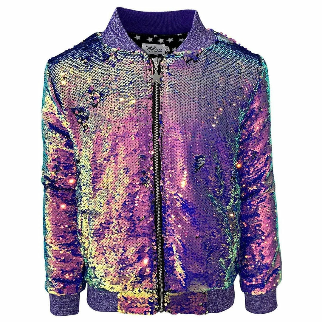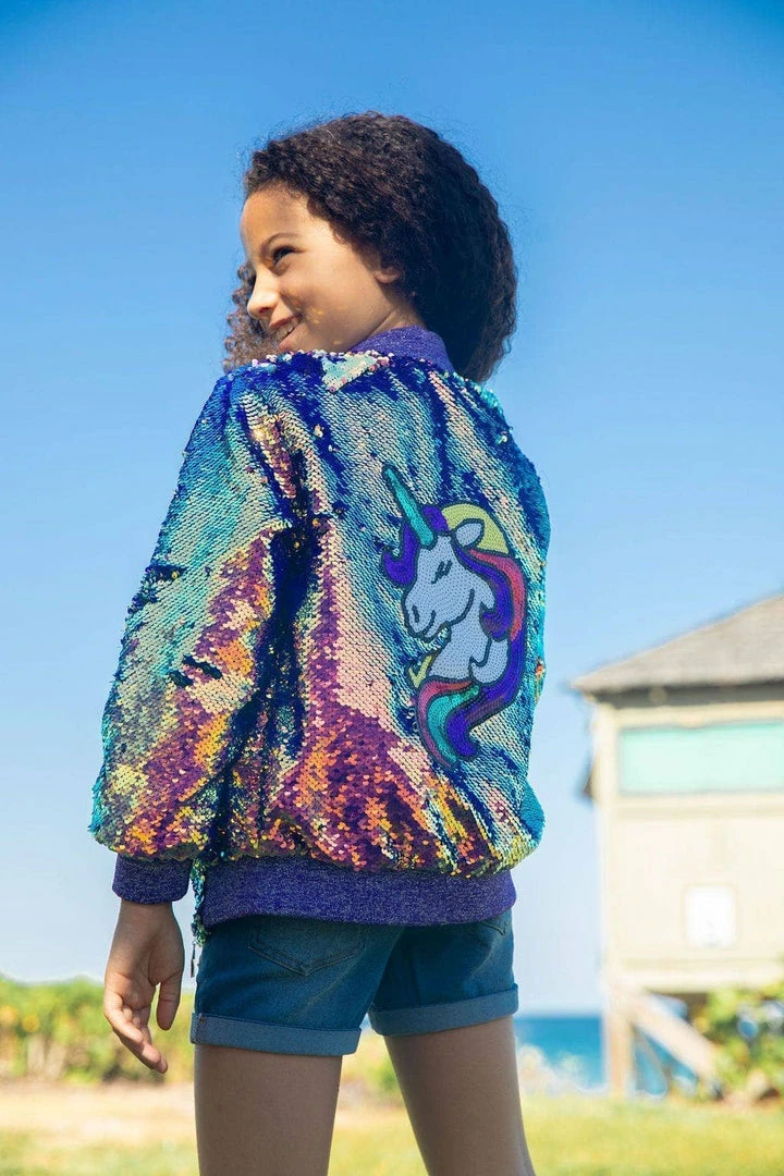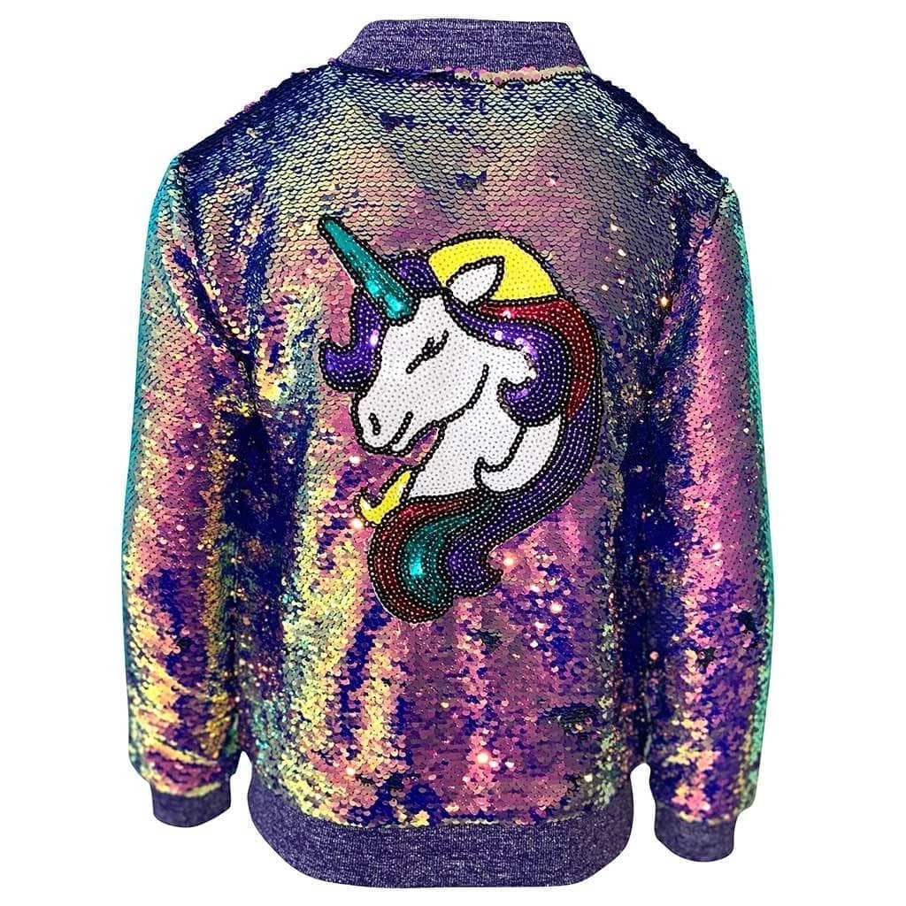 The perfect statement piece for your unicorn lover! This bomber is fully covered in purple sequins with a sequin embellished unicorn patch on the back.Â
