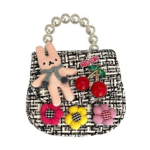 Tweed purses with a pearl handle and bunny, cherry, and flower charms! Coming in pink, black, and baby blue.Â
