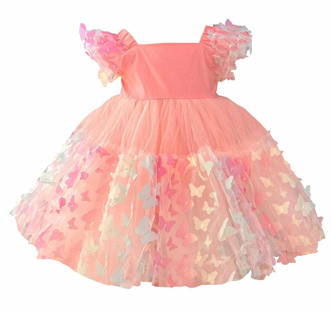 Baby doll style baby pink dress with puff shoulder sleeves covered in ombre 3D flower petals!Â