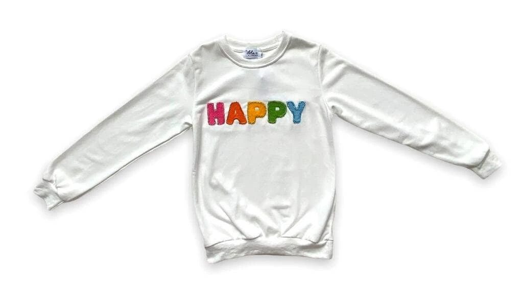 White sweatshirt with “HAPPY” written in rainbow with a crystal outline.