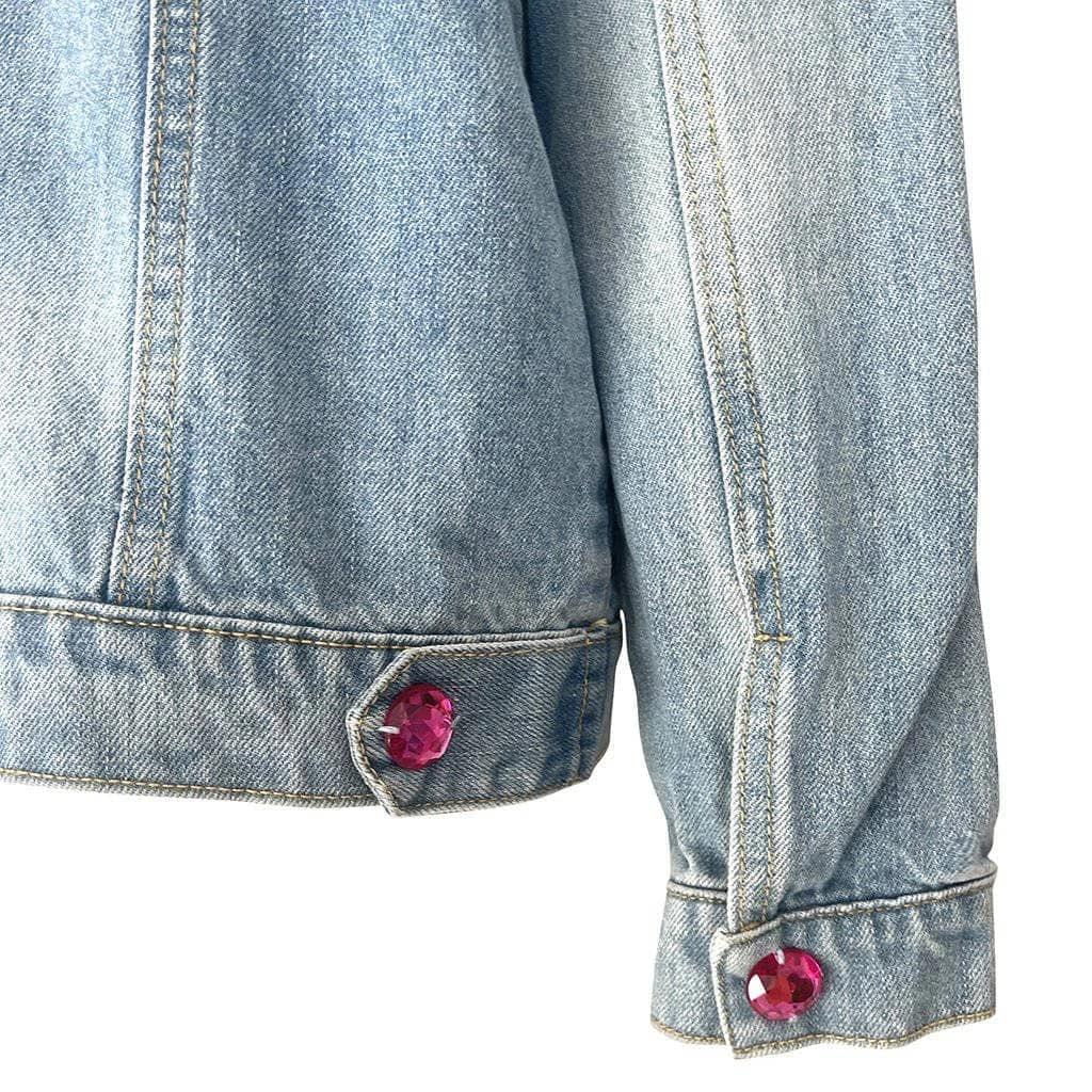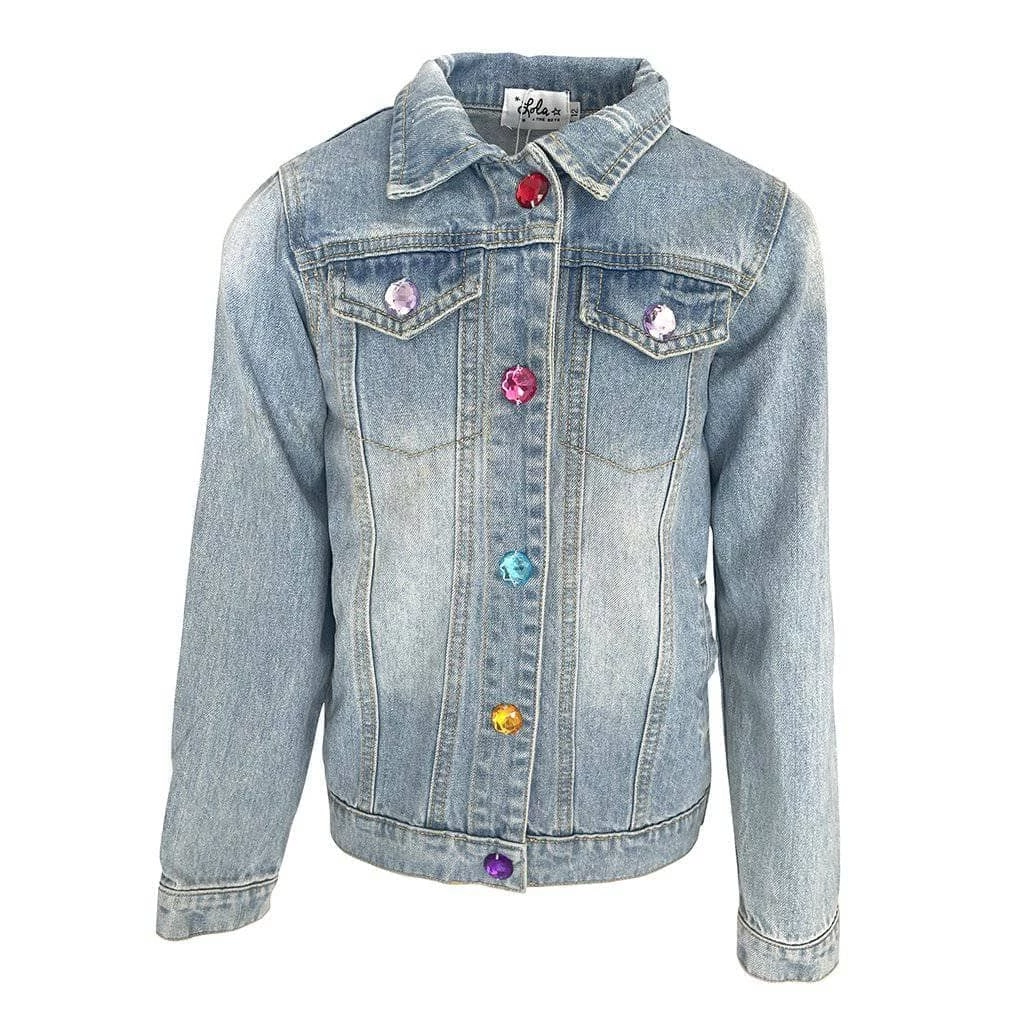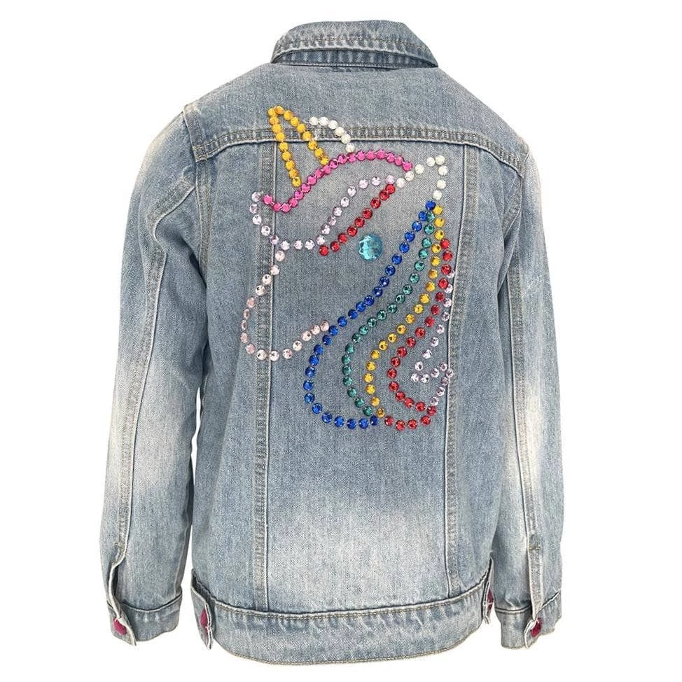 Light wash denim jacket with rainbow gem unicorn outline and large gem buttons!Â