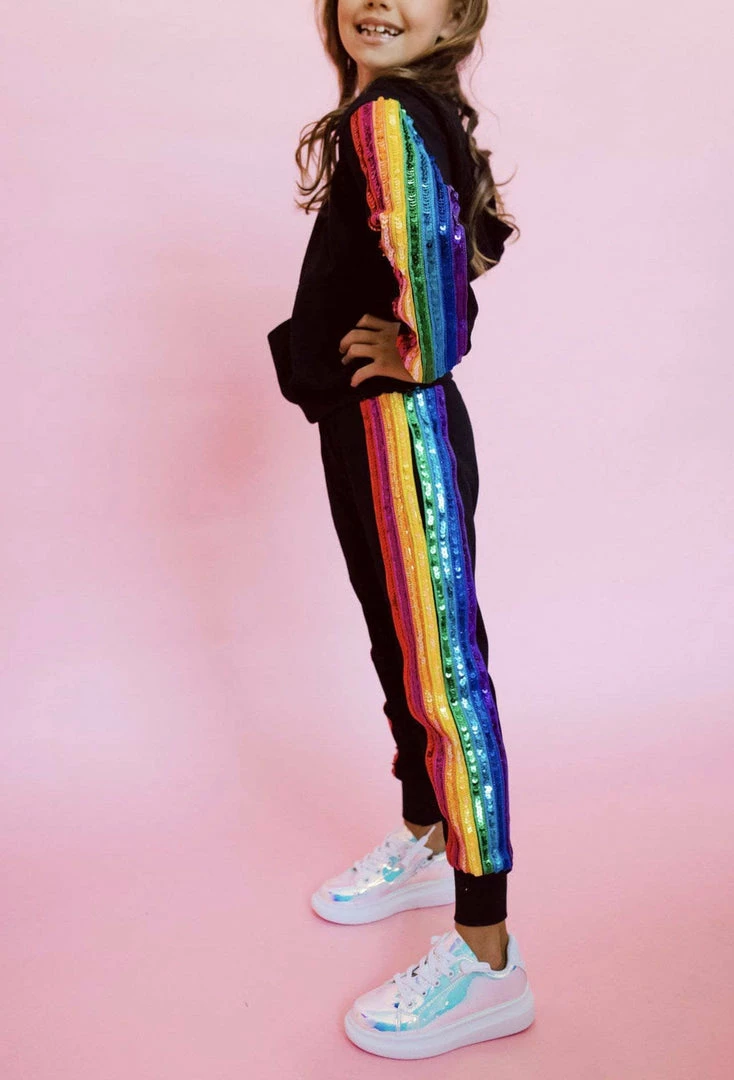 Super soft hoodie with embellished sequin rainbow sleeves and pant legs. Â