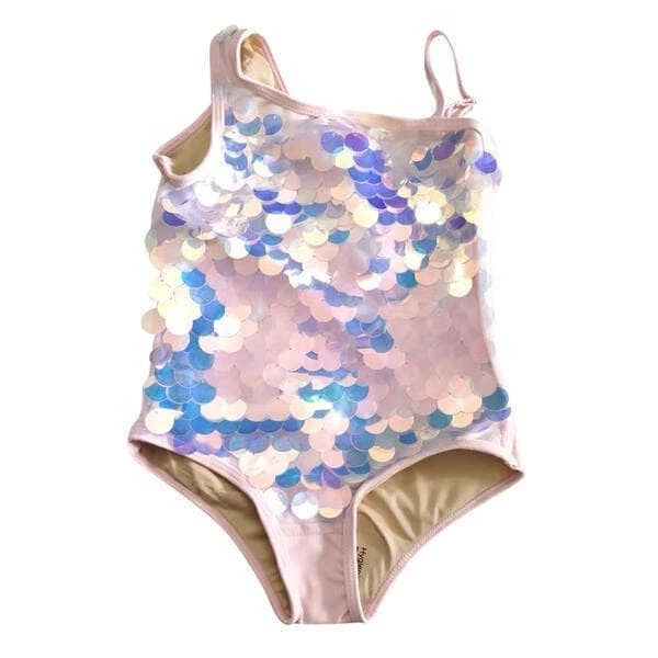 Pale pink paillette swimsuit with one thin strap and one thick!Â
