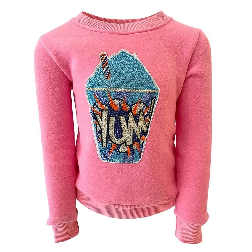 Peachy pink plush and soft crew neck sweatshirt with gemmed YUM soda cup on the front!Â