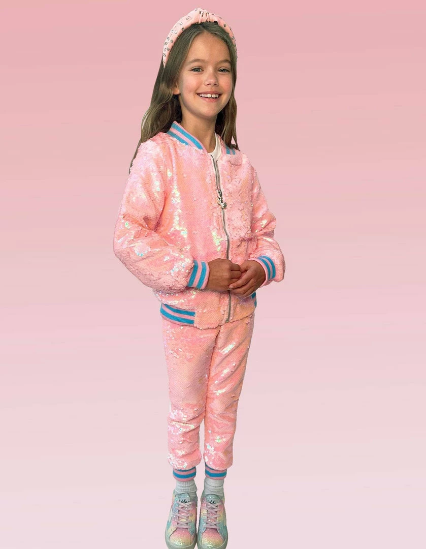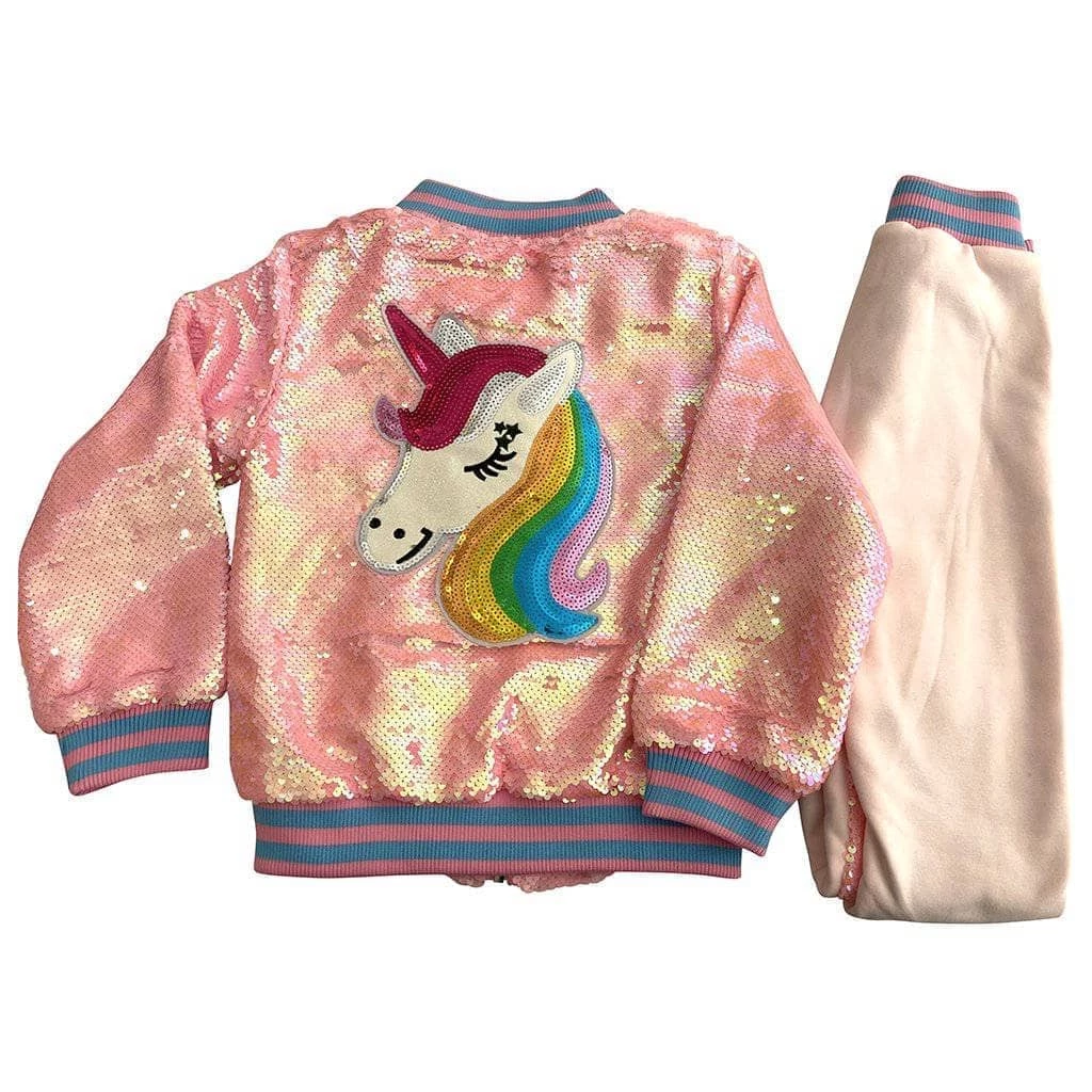 Fully sequined pink bomber and jogger set with colorful unicorn patch on the back! The perfect outfit to make a statement!Â