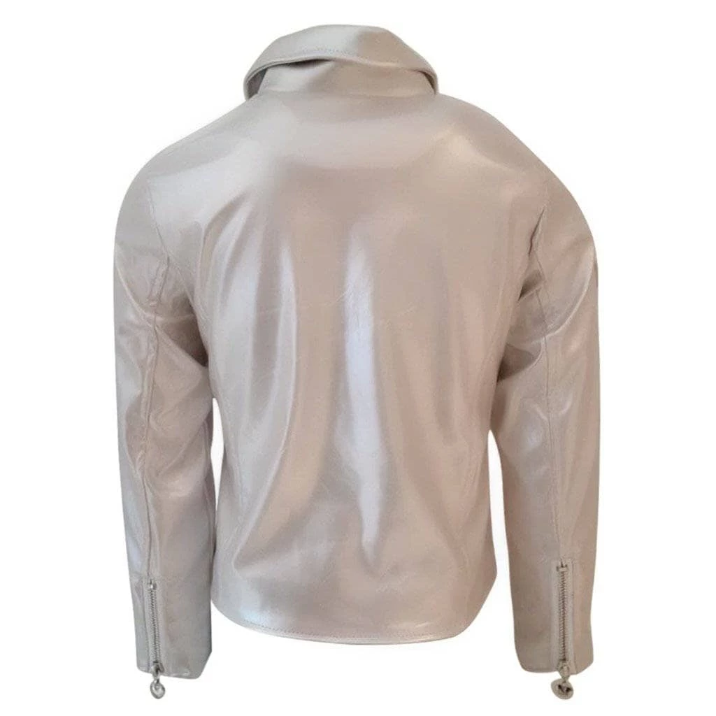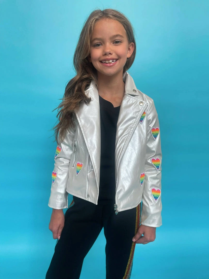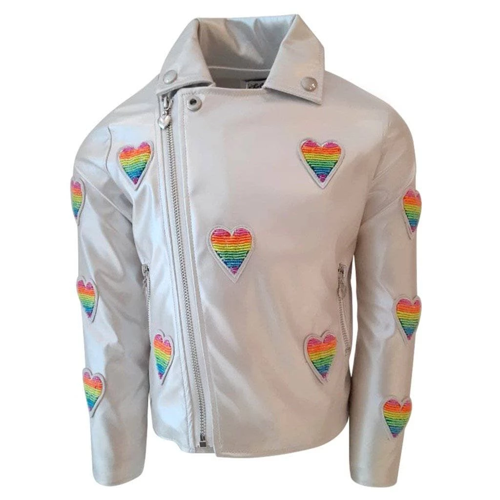 Cream shimmer champagne vegan leather jacket with rainbow beaded rainbow heart patches !Â