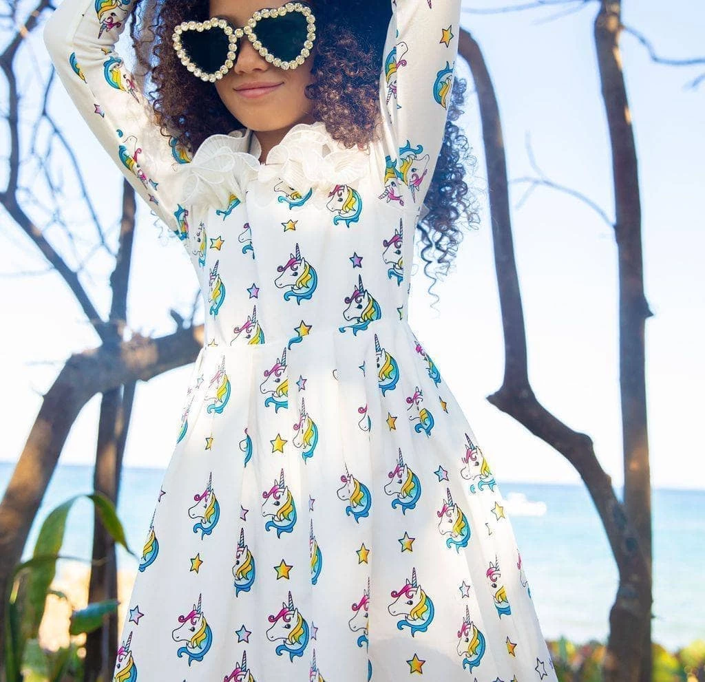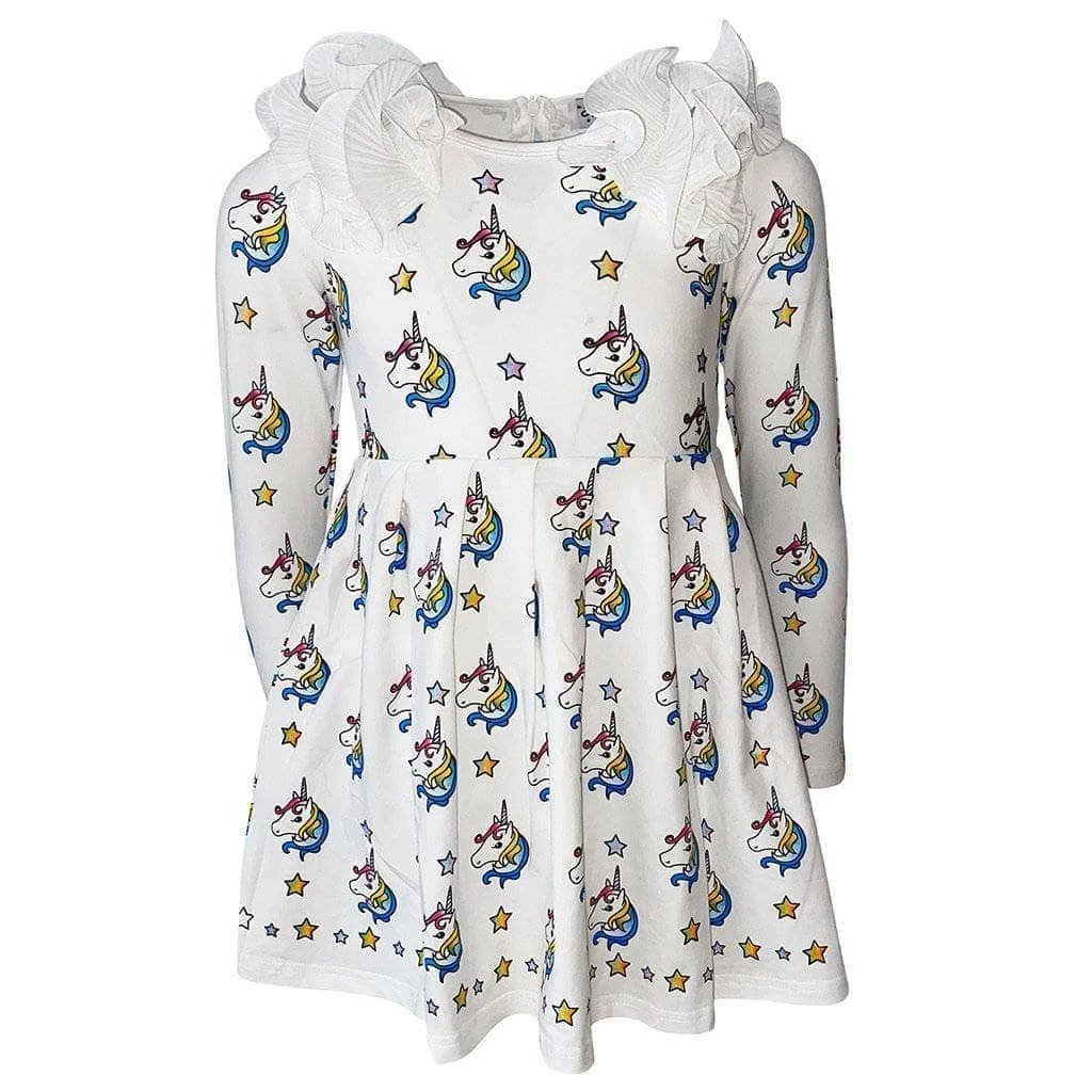 The cutest white long sleeve ruffle shoulder dress! Covered in rainbow ombré unicorns and stars of course!Â
