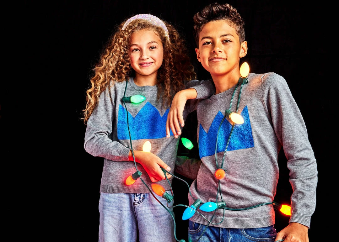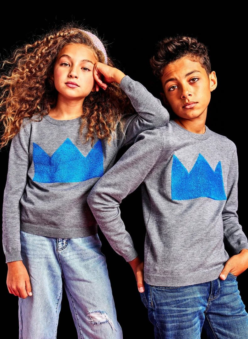 Grey sweater with cobalt blue puff crown on the front! Perfect for boys and girls.Â