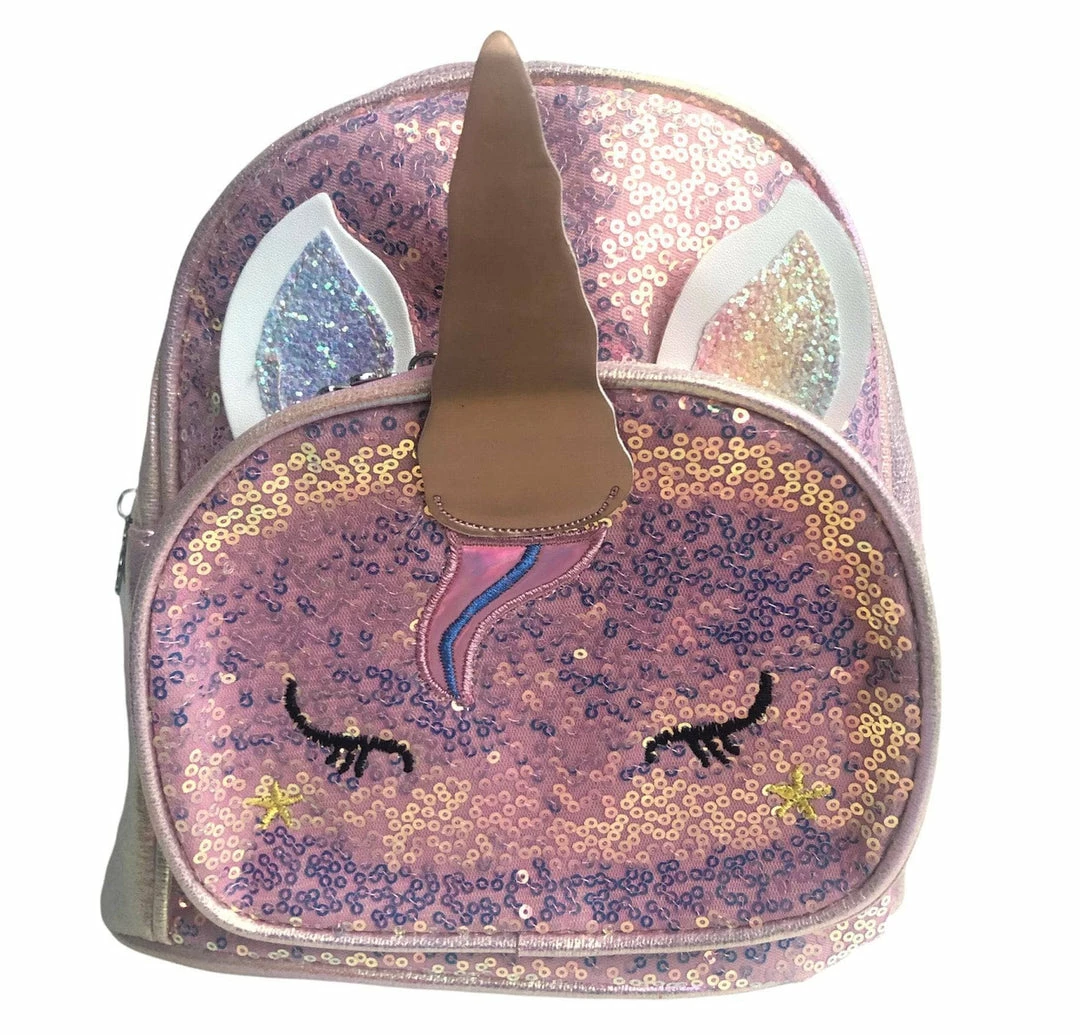 A metallic colorfull sequin sleepy unicorn mini backpack