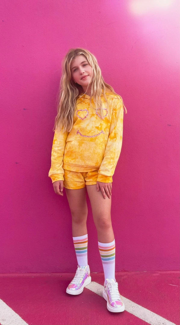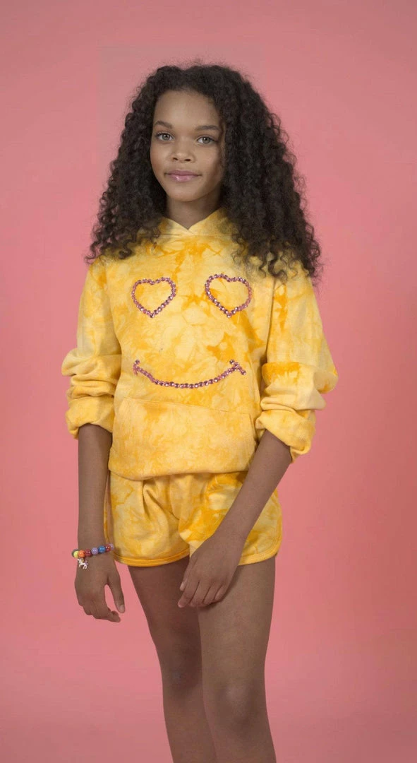Yellow tie dye hoodie and short set with a pink gem heart eyes smiley face