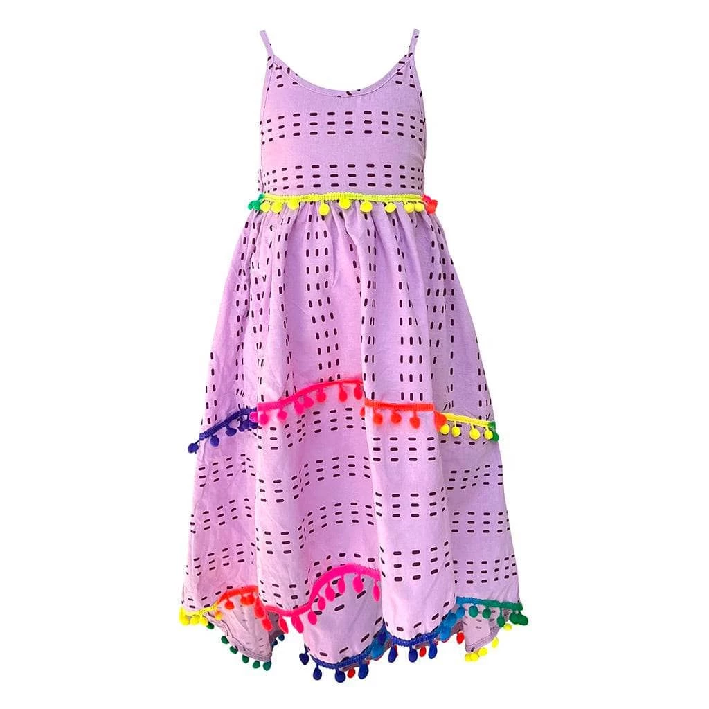 This high low dress is long in the back and shorter in the front, it’s the perfect day to night dress. The Rainbow pompoms give it the perfect pop of color!