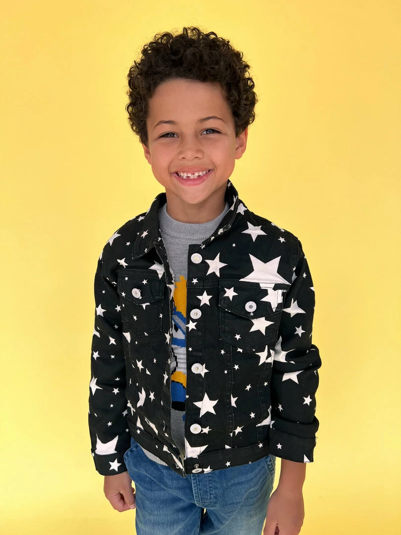Black denim jacket covered in white stars sure to make your little one the star of the show!Â