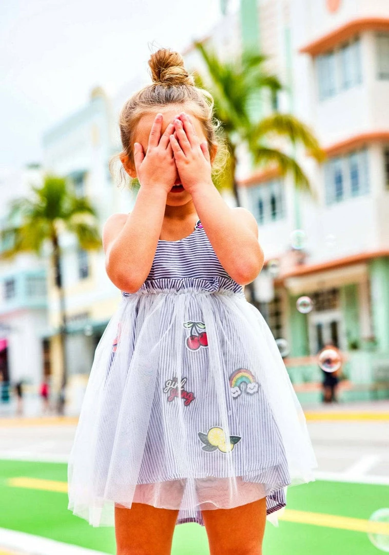 Black and white striped tshirt dress with tulle overlay covered in colorful rainbow patches and candy bead straps!Â
