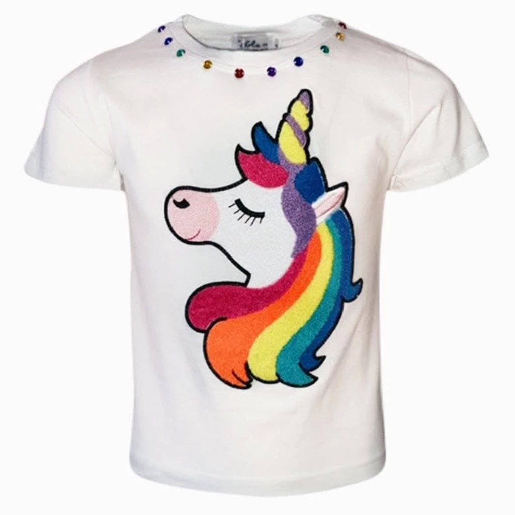 The cutest white tee with rainbow gems on the collar and neon unicorn patch front and center!