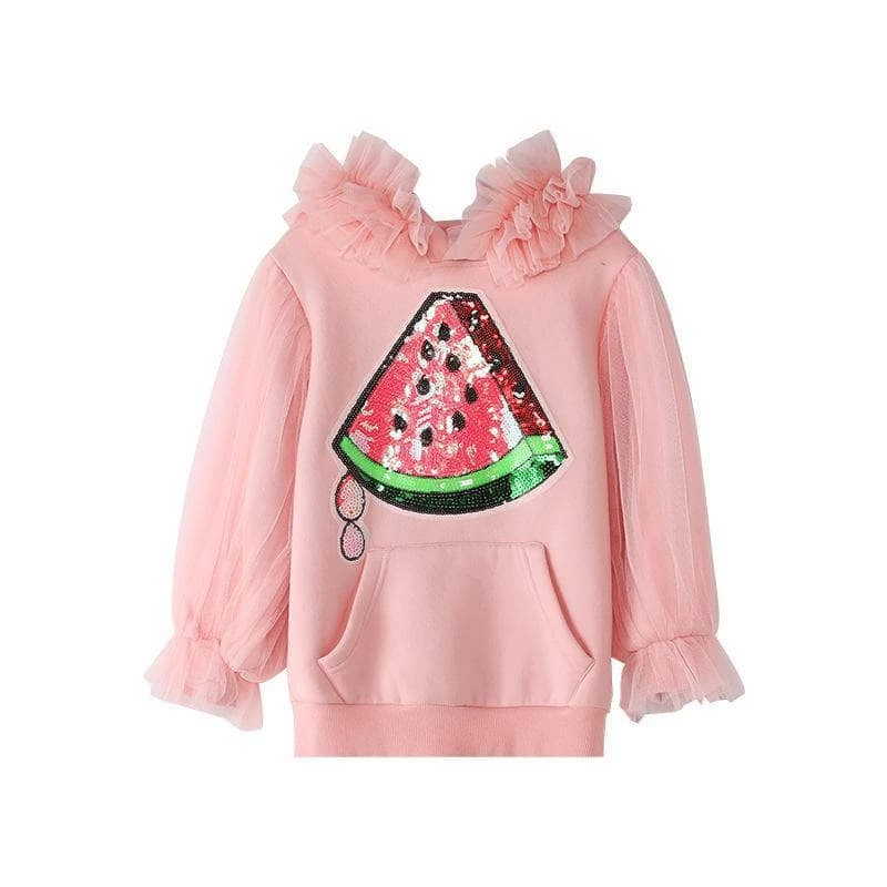 Pink hoodie with sequin watermelon slice with tulle detail on arms and hood!